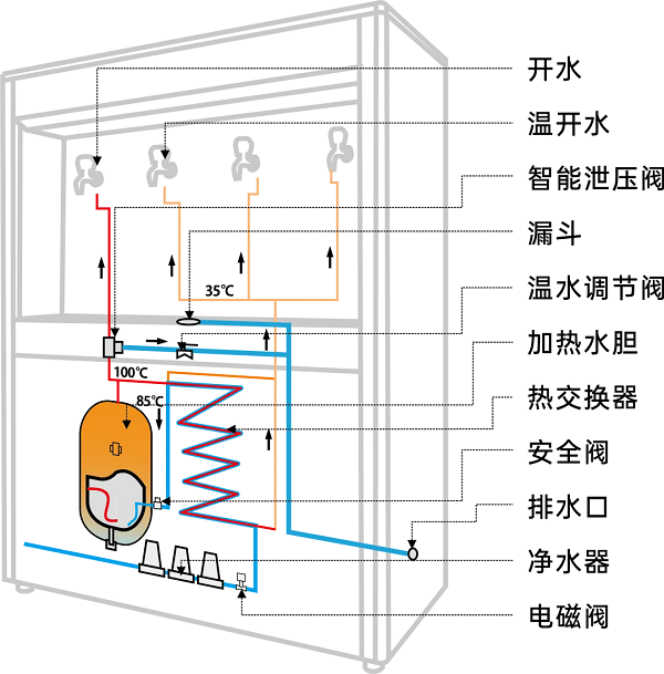 備采用節能熱交換技術,熱損低,更節能;保溫結構設計,保溫效果好。多水龍頭布局,有效應對飲水量大與飲水集中的問題,確保供水順暢。特別設計的溫開水出水口,貼心呵護小學生的飲水需求,安全又溫馨。