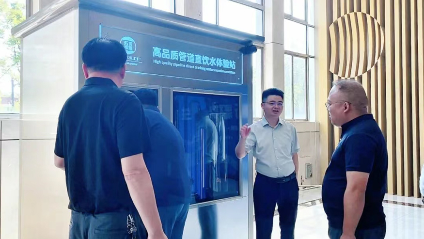 白冰董事長一行認真聽取講解,還就榮事達管道直飲水項目的設備性能、技術原理等細節與陪同人員深入交流。榮事達管道直飲水項目是針對社區、學校、醫院、企事業單位及工廠等場景,提供定制化飲水模式,涵蓋社區智慧水站、校園智慧凈水屋、高端直飲水設備及變頻供回水系統,旨在為民眾打造便捷、高端、健康的飲水服務。