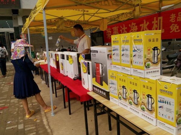 5月26日,榮事達在河南信陽甘岸鎮(zhèn)開展“榮事達凈水機 入小區(qū) 下基層 送健康”活動,推廣健康飲水。榮事達凈水產(chǎn)品深受當?shù)叵M者喜愛,活動當天售出30多臺機器。
