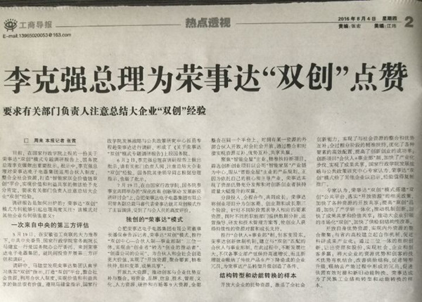 •         日前,在國家行政學院上報的一份關于榮事達“雙創”模式專題調研報告上,國務院總理李克強做出重要批示。批示中,李克強總理對榮事達電子電器集團運用合伙人制度,整合全社會資源,打造“智能家居全價值鏈雙創”平臺,實現價值和利益共享的做法給予充分肯定,要求有關部門負責人注意總結大企業“雙創”經驗。