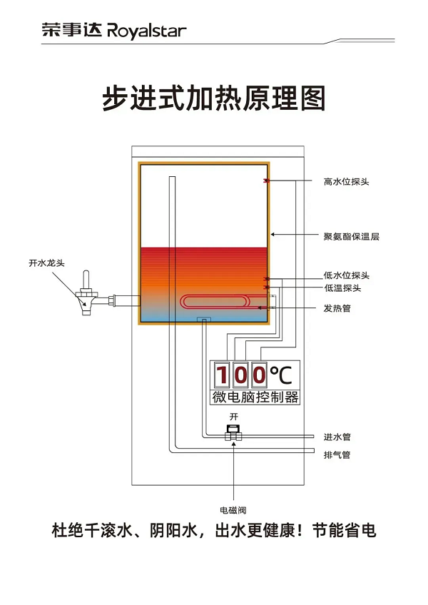 設備采用了RO反滲透技術、多級凈化等工藝,有效去除了水中的泥沙、鐵銹、重金屬、余氯等有害物質,確保水質干凈、安全。同時,步進式加熱設計避免了陰陽水的產生,保證了連續供應開水的品質。